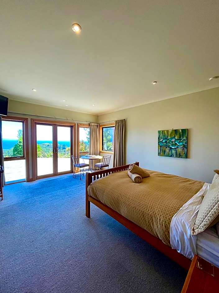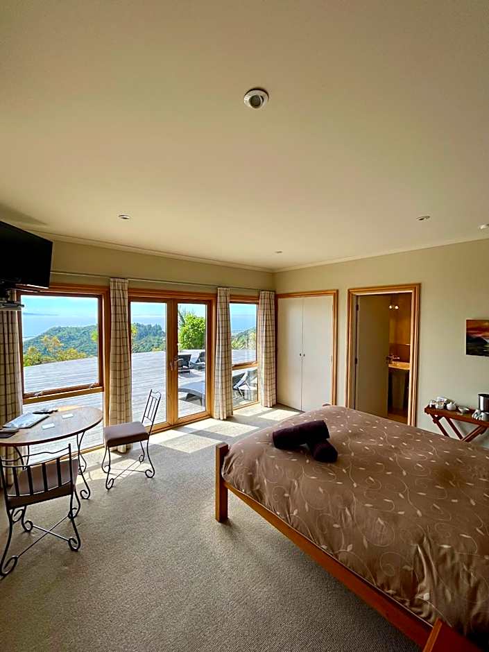 This room features views of Mount Arthur and Tasman Bay. It has wooden French doors that open onto the balcony. You can enjoy sea views from your bed.